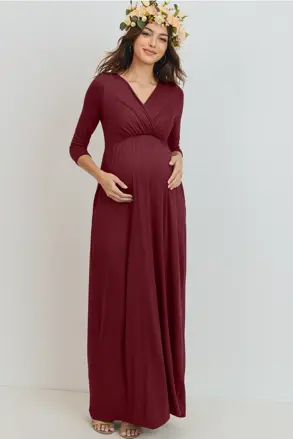 Výrazné vínové maxi šaty s 3/4 rukávom, navrhnuté pre maximálne pohodlie počas tehotenstva a dojčenia. Čítajte viac